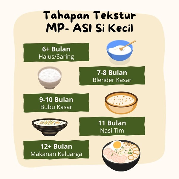 Mulai usia enam bulan, bayi memerlukan Makanan Pendamping ASI (MP-ASI). Tanda kesiapan anak antara lain bisa duduk dengan tegak, tertarik pada makanan, dan mulai mencoba mengambil makanan sendiri. Pemberian MP-ASI dilakukan secara bertahap, disesuaikan dengan usia dan perkembangan anak.